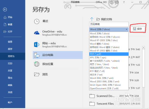 点击三角形符号之后,呈现下拉菜单,在显示的下拉菜单中我们点击“PDF”格局,然后点击“保留”按钮,如下图所示。