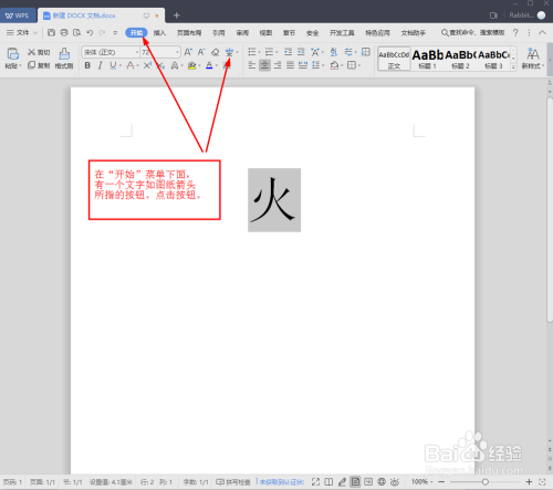 在“起头”菜单下面,有一个文字如图纸箭头所指的按钮。点击按钮旁边的下拉按钮,进入下一步。