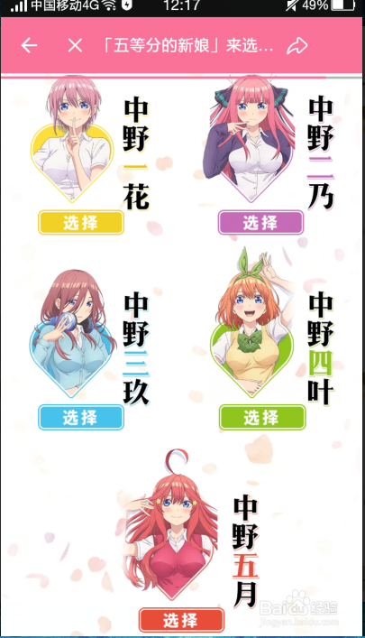 这时我们标的目的下拉页面,就可以看到动漫《五等分的新娘》里的脚色,大师点击脚色底下的【选择】选择本身喜好的脚色,建议多点几回,页面弹出【本周您已选择真爱】就代表投票当作功啦!好想全都要啊啊啊啊啊啊