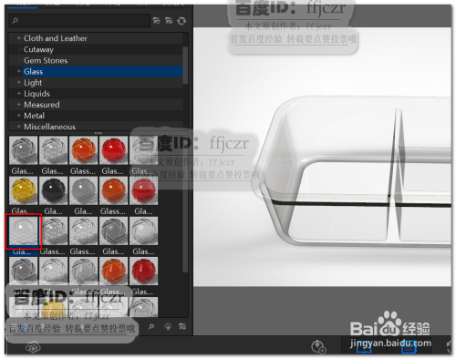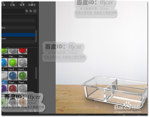 直接从材质库中选择材质付与模子。这里选用塑胶中的透明材质。可以看到模子中呈现了黑色区域,固然衬着出来的透明材质已表示出来,但这并不是想要的。
