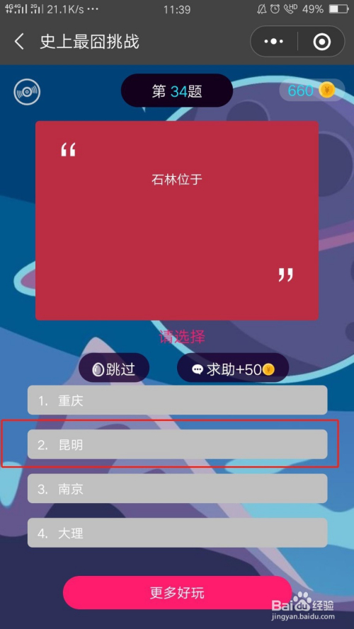 史上挑战最囧第三十四关过关攻略:选择第二个选项:昆明