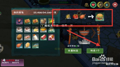 第四步,把筹办好的【烤鸡腿】【小麦】【西红柿】全数放到烹调锅中,点击建造1个,如下图