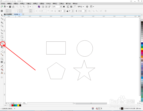打开CorelDRAW X8软件,点击【矩形东西】,绘制一个矩形图案;点击【椭圆东西】绘制出一个圆形图案;点击【多边形东西】绘制一个五边形图案;点击【星形东西】绘制一个星形图案(如图所示);
