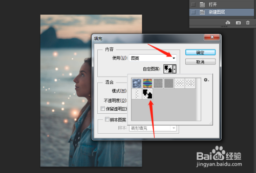 找到本身喜好人物图片,先新建一个图层,接着在按Shift+F5选择图案找到自界说图案