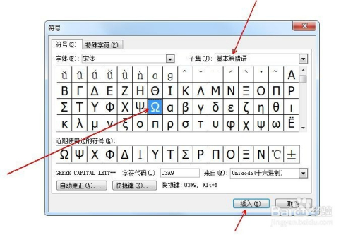 在“子集”中选择“根基希腊语”,并鄙人方选中年夜写希腊字母欧米伽Ω,点击“插入”。