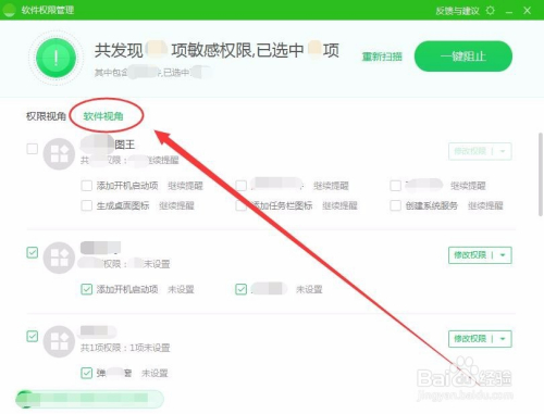 单击点窜权限按钮,可以对软件权限设置阻止、许可和继续提醒。