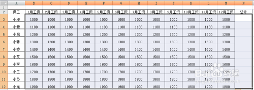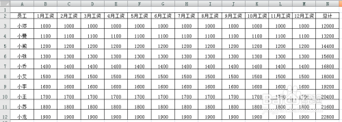 4-在B3至B12区域输入1月工资的金额,按如上方式选中B3至B12区域,点击B12上的小点标的目的后拖拽至M列使之主动填充响应的数值,若每月工资金额纷歧致则需要手动输入