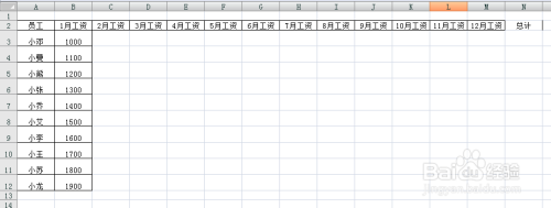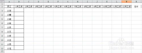 3-鼠标左键选中“1月工资”单位格,按住右下方的小点鼠标不放往后拖拽至M2单位格,后面的单位格会主动按月份挨次来填充内容,在N单位格输入总计