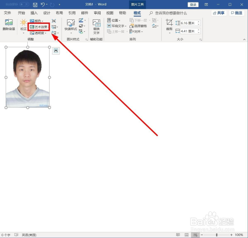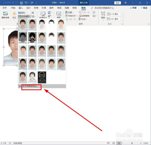 选中图片,选中“格局”选项卡,单击“艺术结果”