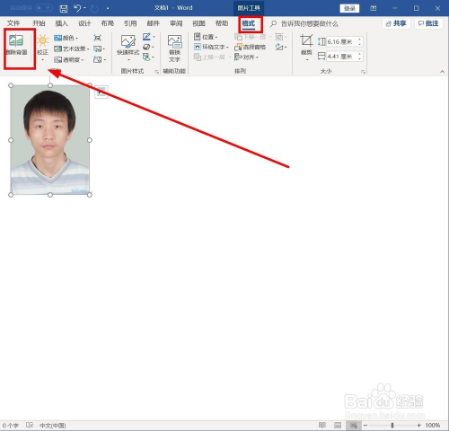 选中证件照图片,然后选中“格局”选项卡,单击“删除布景”