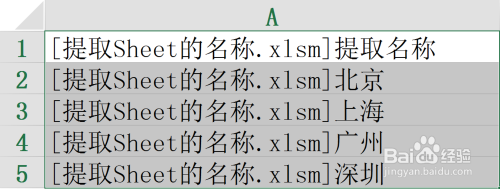 如下图,假定我们要将Sheet名称"海说神聊京"、"上海"、"广州"、"深圳"提掏出来,放置在Sheet名称为"提取名称"的Sheet中。