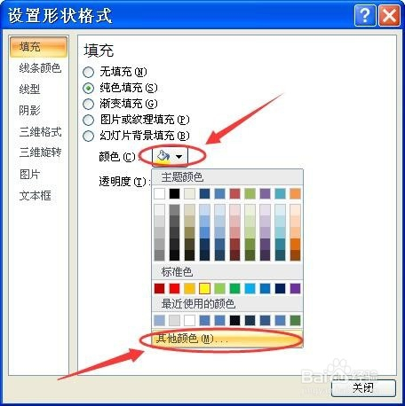 在设置外形格局的对话框中选择“填充-纯色填充”如图。