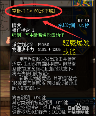 DNF驱魔白金徽章选择三:选择驱魔改版后新加的一个爆发技术“空斩打”。