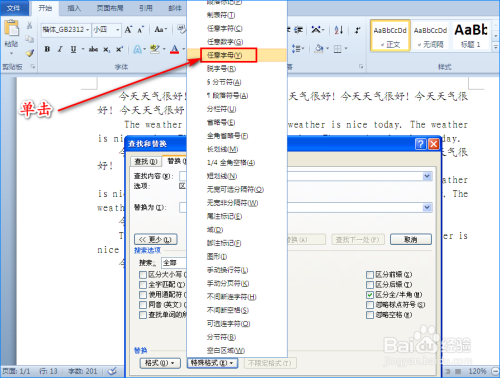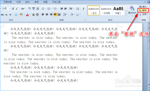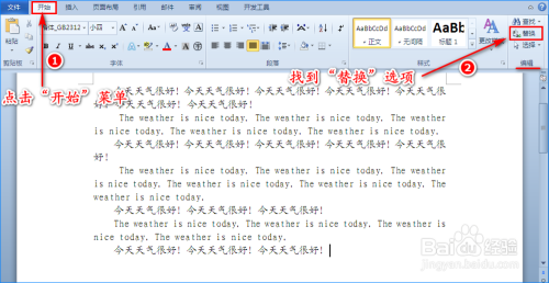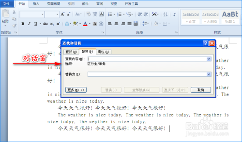 打开中英夹杂的Word文档,我们先点击“起头”菜单,接着在其子菜单“编纂”组中找到“替代”选项并单击,这时会弹出对话窗。如图所示: