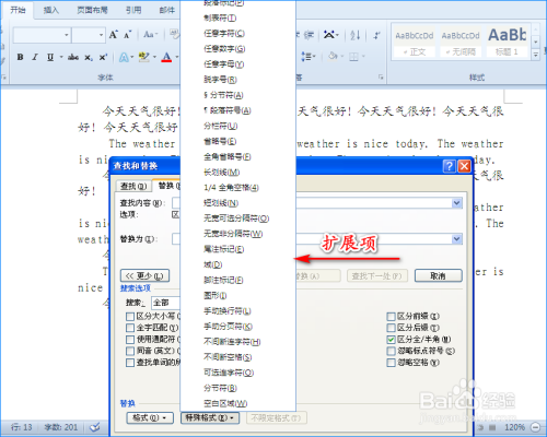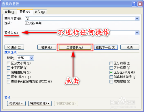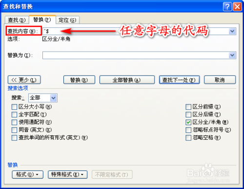 紧接着在“特别格局”的扩展项中我们点击“肆意字母”,这时对话窗中“查找内容”处就会呈现了一个代码(^$)。