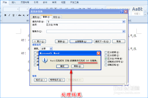 因为我们是要删除文档中的英文,故对话窗中“替代为”处不消进行任何操作。最后我们点击“全数替代”按钮,这时会弹出处置成果。如图所示: