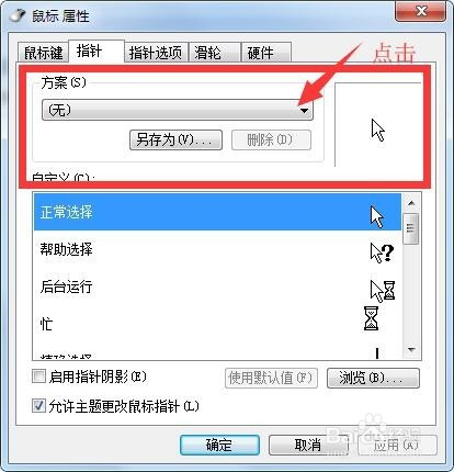 在进入win7系统鼠标属性中指针设置的本家儿界面后,在方案栏,点击下拉按钮并鄙人拉菜单中选择你想要更改的鼠标外不雅的方案