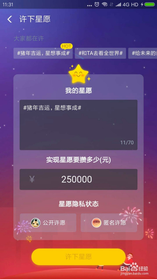 我们在使命界面点击去完当作,然后填写本身的心愿、需要攒的钱数、选择隐私状况就可以许愿了。