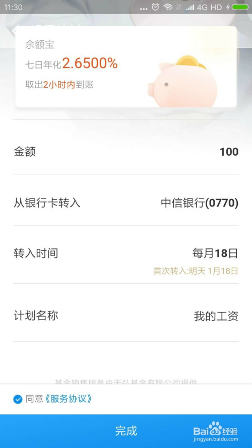 按照系统的提醒,我们设定银行卡信息、转入时候等信息,然后点击完当作。