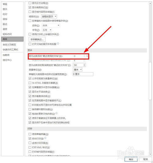 会发现“显示”下面第一项“显示此数量的比来利用的文档”后面的数字是“0”,这是不克不及显示“比来文档”的“祸首祸首
