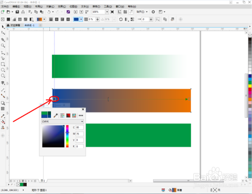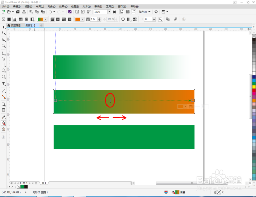 选中第二个矩形图案,同样点击【渐变填充】进行渐变操作。将上方节点颜色选择为橘色,此时便完当作了从绿色到橘色的渐变。同样,直接点击节点,可直接改换颜色(如图所示);