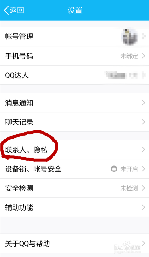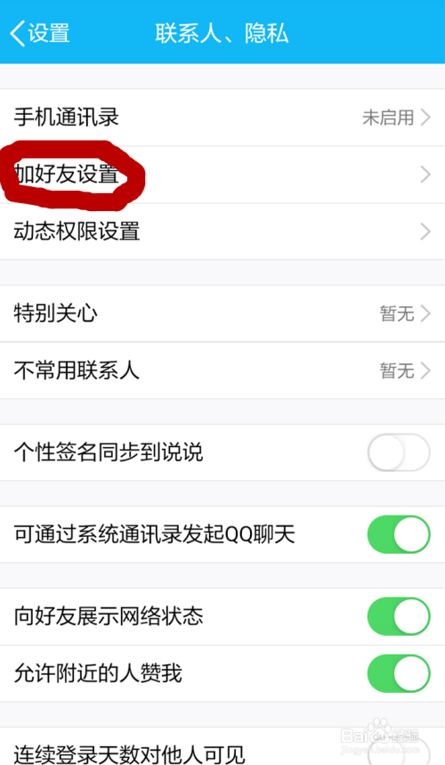 在联系人、隐私中我们便会看到第二栏是加老友设置,这时点击加老友设置我们便可以看到五个选项。
