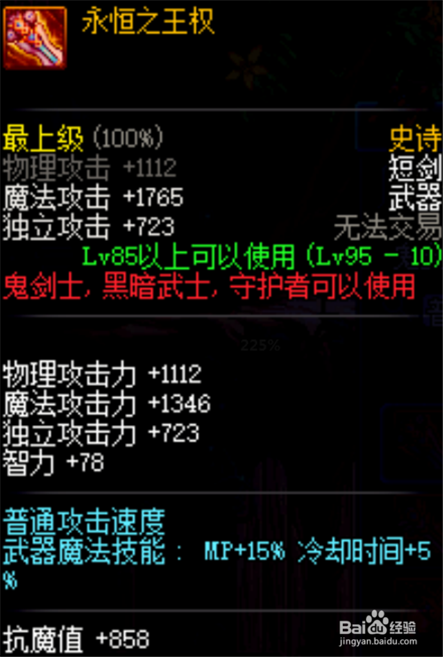 永恒王权,这把短剑的释放速度仍是很是给力的,有2%的加当作,属性强化也是很带劲的,不外感受释放都是年夜佬选择的,所以这个仍是相对而言性价比有点低。