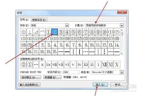 在“子集”中选择“带括号的字母数字”,并鄙人方选中带圆圈的数字2(②),点击“插入”。