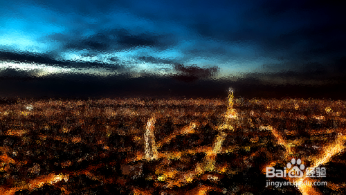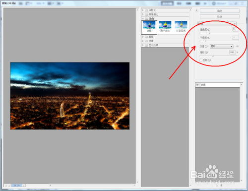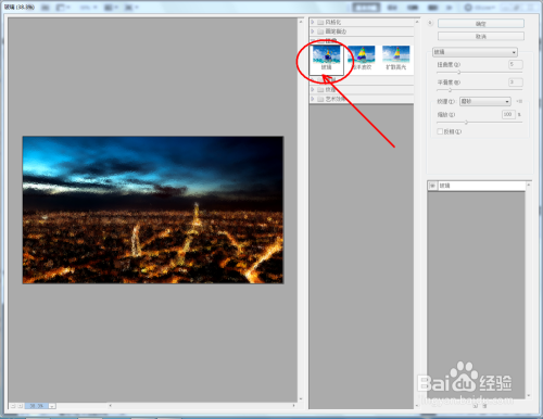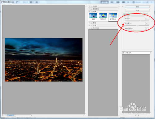 点击【滤镜】-【扭曲】-【扩散亮光】,弹出扩散亮光设置框,按图示对扩散亮光的粒度、发光量、断根数目的参数进行设置(如图所示);