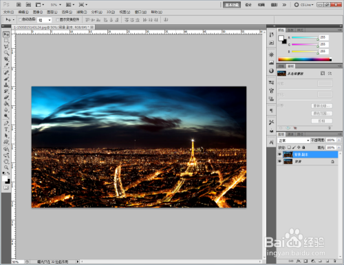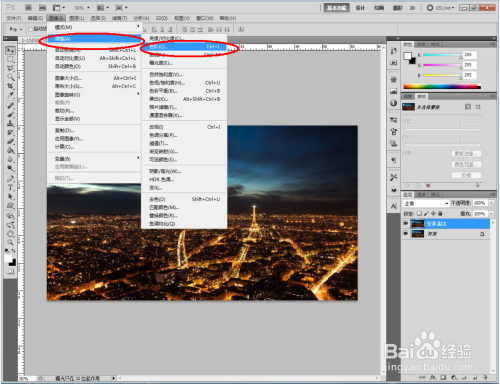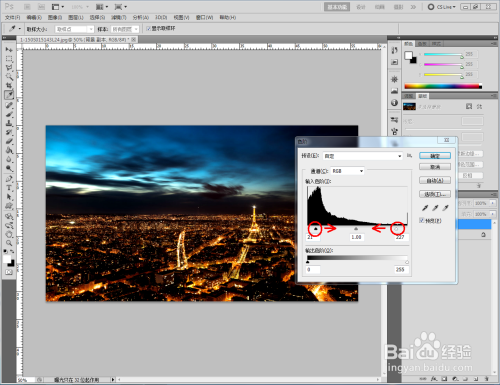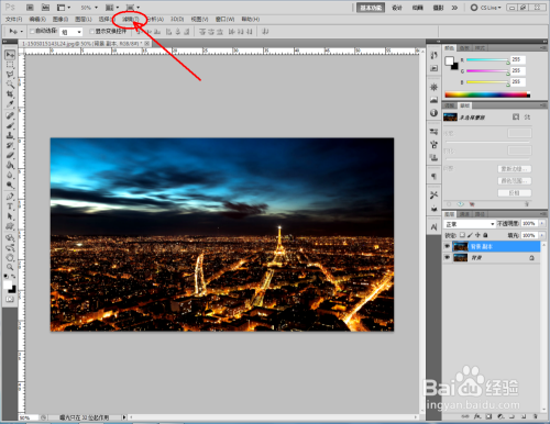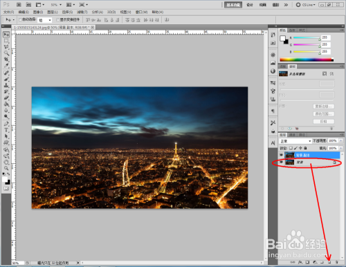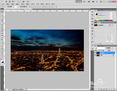 打开Photoshop CS5软件,将图片拉进软件中打开,鼠标拉动布景图层至【新建图层】图标处新建一个图层。点击【图像】-【调整】-【色阶】,对图片的对比度进行调整(如图所示);