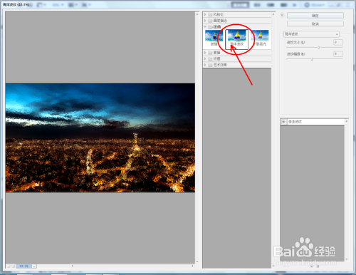 点击【滤镜】-【扭曲】-【海洋波纹】,弹出海洋波纹设置框,按图示对海洋波纹的波纹大小、波纹幅度的参数进行设置(如图所示);