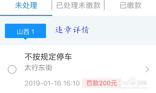 点击页面最上方的违章选项,即可查看到违章详情,好比说违章原因是闯红灯仍是不按划定泊车,并且还会有惩罚时候显示等,如图所示...