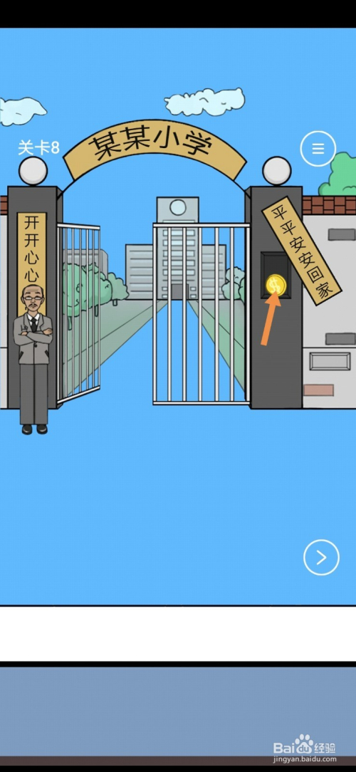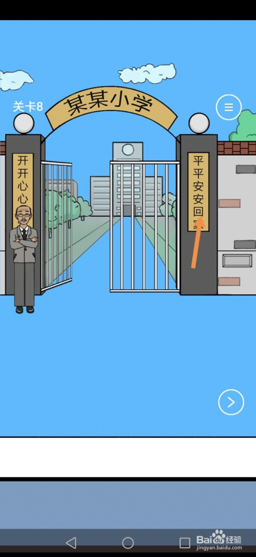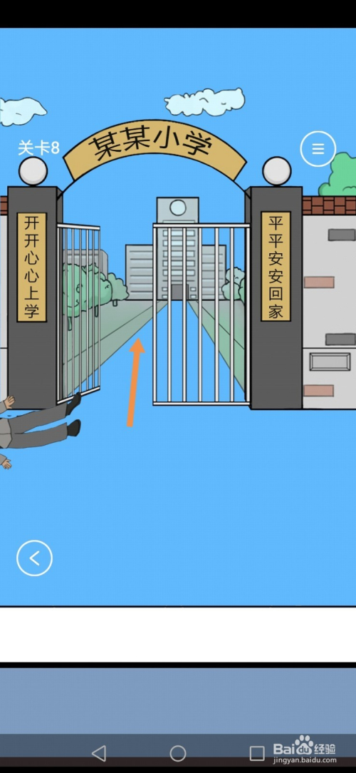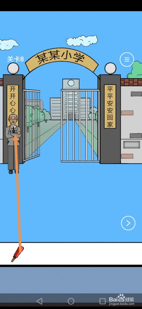 在右边,点击下图中箭头标注的位置,然后点击校门口就过关了。