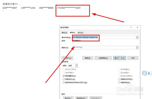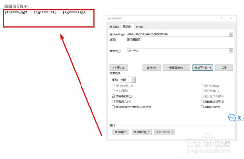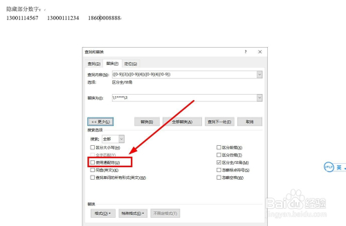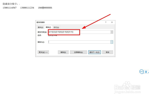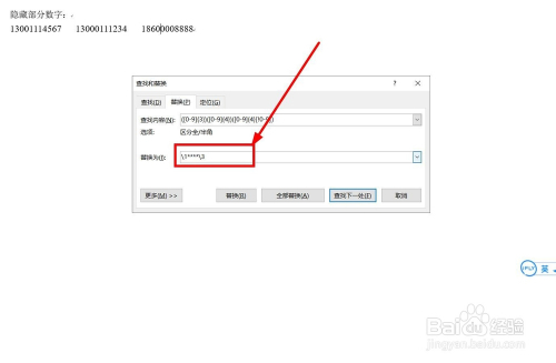 在”查找和替代“对话框单击”替代“选项卡,在查找内容中输入”([0-9]{3})([0-9]{4})([0-9]{4}[!0-9])