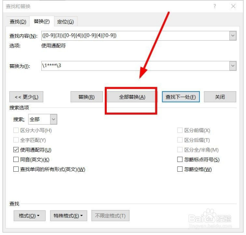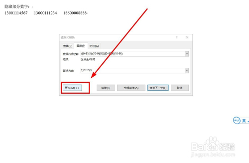 在“替代为”输入“\1****\3”,输入完毕,单击“更多”