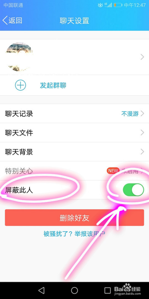 我们此时只要将屏障此人的功能开启即可屏障该老友发送的信息和与之相关的内容。