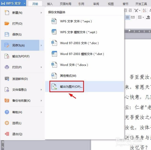 第二步:单击左上角“wps文字”,“另存为”中选择“输出为图片”。