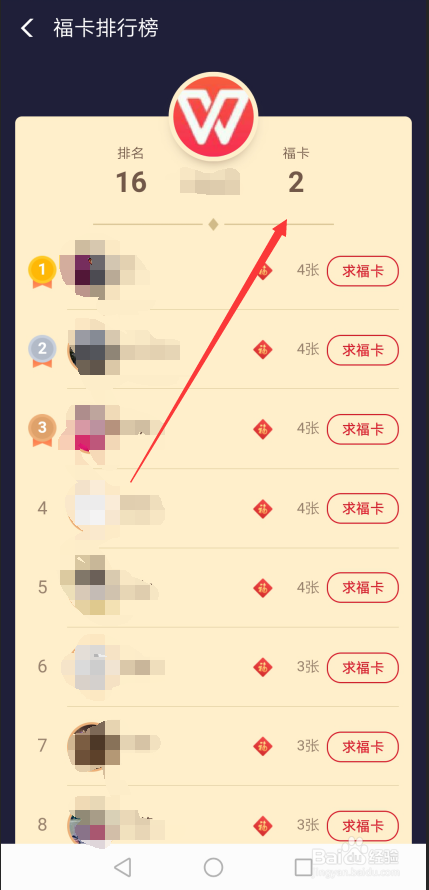 也可以点击我的福卡界面右侧的【福卡排行榜】进入付出宝福卡排行榜来查看本身福卡的总数,如下图所示。