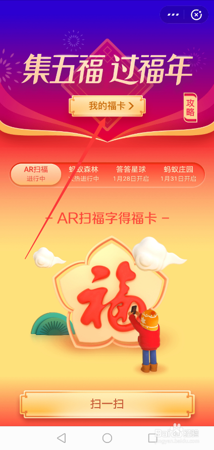 进入付出宝2019扫福字集福卡界面后,直接点击下面的【我的福卡】,如下图所示。