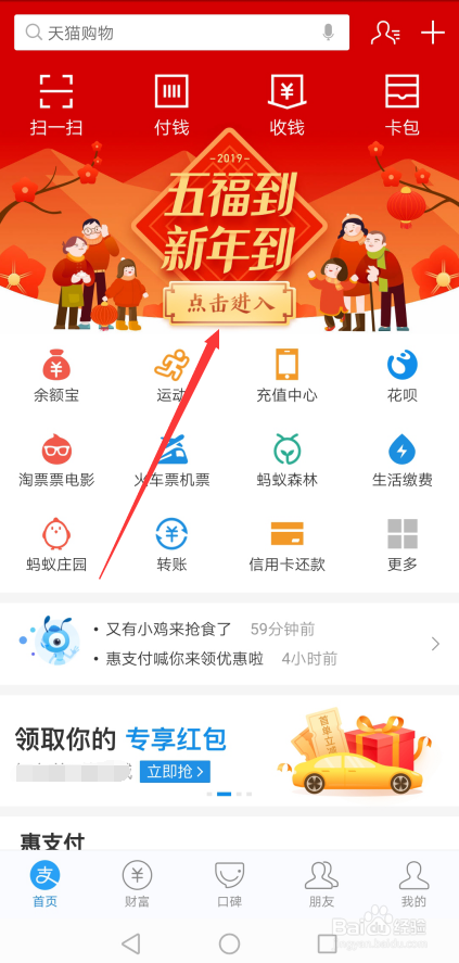 当作功登录付出宝后,在付出宝首界面就可以看到2019年五福到新年到活动图片,直接点击【点击进入】,如下图所示。