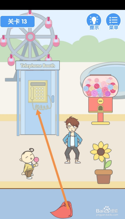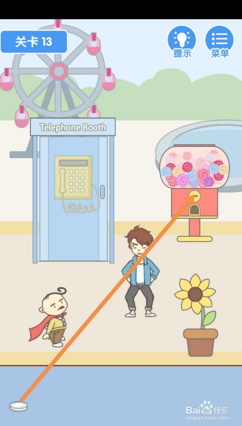 第13关先点击硬币,然后将硬币拖动到棒棒糖投币口。