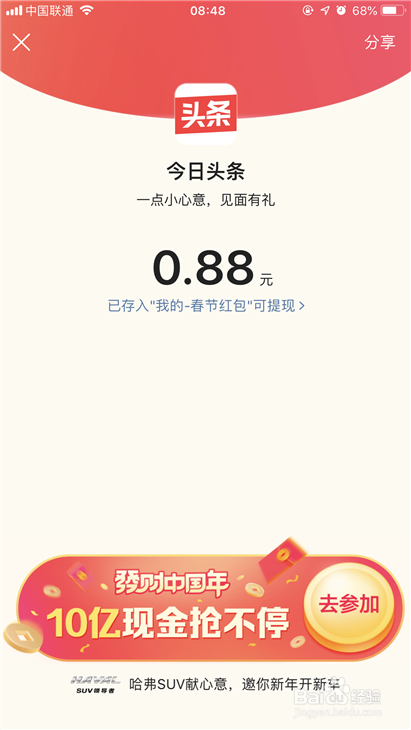 然后彻底封闭我们的今日头条,不是推出哦,是将应用封闭。彻底封闭。然后登录到本家儿界面,就会直接看到一个红包。
