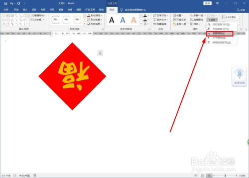 选中菱形和艺术字,在“格局”选项卡下面找到“摆列”中的“扭转”单击,鄙人拉菜单选中“垂直翻转”单击