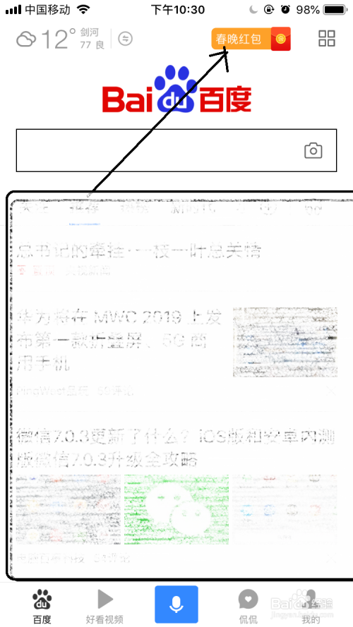 打开手机上安装了百度App并点击后可进入到百度App首页界面中在右上角的点击“春晚红包”标识按钮。