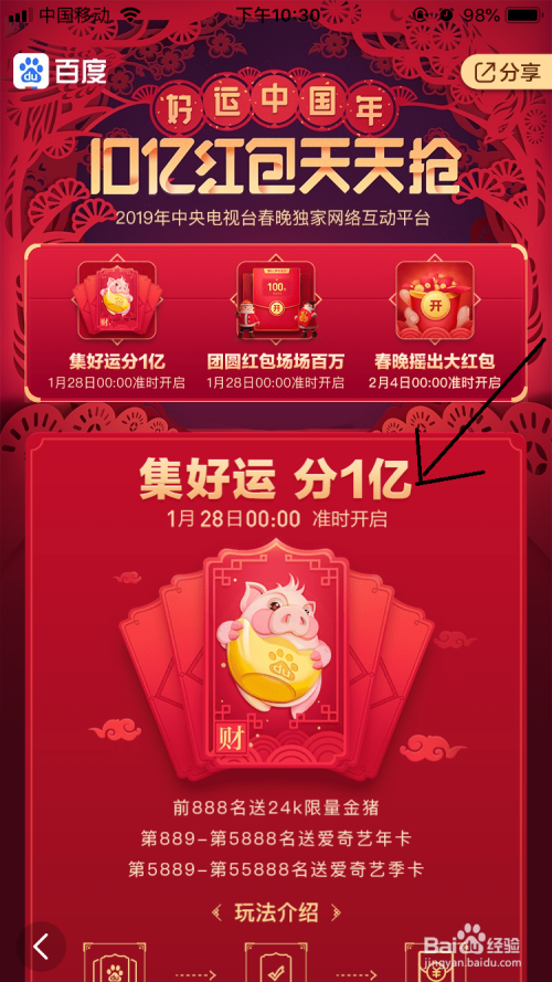 然后打开“10亿红包天天抢”活动界面中有集好运、团聚、看春晚这三个年夜块瓜分抢红包。此中集好运瓜分红包1亿在1月28日准时开启,这个专项活动仿佛跟付出宝集福近似的弄法才能获得红包。