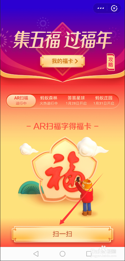 在集五福界面里,可以直接点击AR扫福,进行扫福字集花花卡,如下图所示。