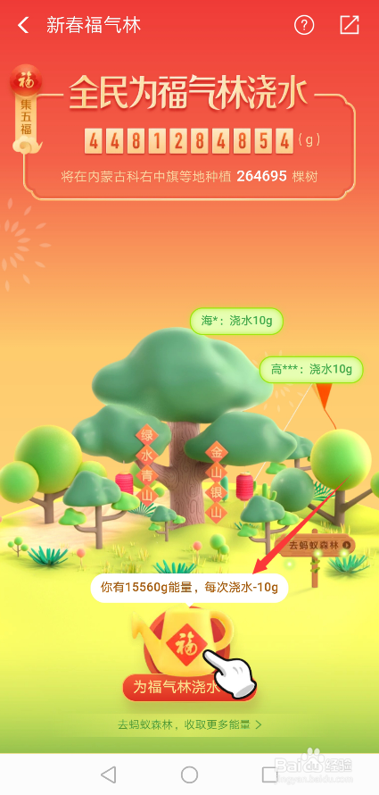 还可以在集五福界面里,点击蚂蚁丛林去浇水,如下图所示。