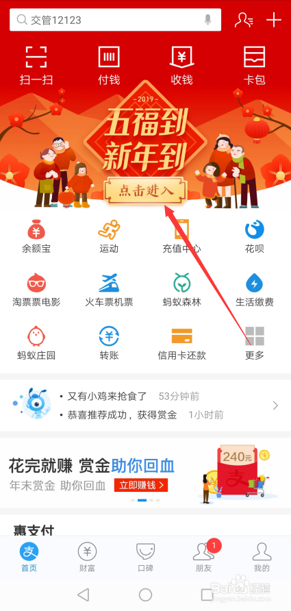 要想获得花花卡,先打开付出宝,仍是要点击进入五福卡界面,如下图所示。