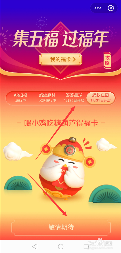 在1月28号的时辰,还可以经由过程在集五福界面里点击答答星球答题赢福卡的花花卡,如下图所示。