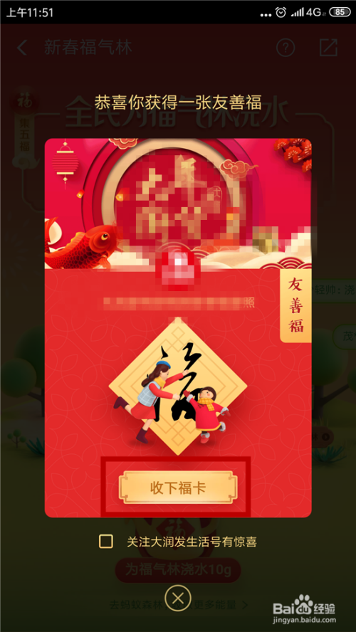 浇完水后会随机获得五福中的一个福卡,小编这里又获得了【友善福】,点击【收下福卡】。